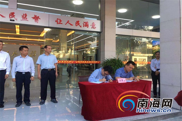萬寧市行政審批服務(wù)局局長茹祥與行政許可事項(xiàng)劃出單位代表市衛(wèi)生健康委員會主任吳云峰簽訂行政許可事項(xiàng)劃轉(zhuǎn)審管銜接備忘錄。 南海網(wǎng)記者 王康泰攝