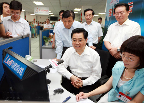 最近胡錦濤總書記視察了人民網和人民日報,發(fā)表了重要講話,并同網民進行了網上對話,表明我國領導人的高度開放、誠實與自信。胡錦濤總書記與網民的在線交流,為中國各級官員作出表率。