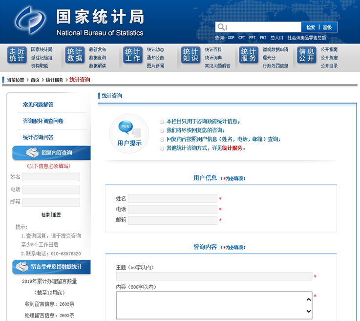 2.暢通統(tǒng)計(jì)咨詢(xún)服務(wù)渠道。一是提供多渠道服務(wù)方式,便利公眾獲取統(tǒng)計(jì)信息并提出意見(jiàn)建議。2019年,國(guó)家統(tǒng)計(jì)局通過(guò)電話(huà)咨詢(xún)、網(wǎng)站“統(tǒng)計(jì)咨詢(xún)”欄目、電子郵箱、“局長(zhǎng)信箱”、新媒體平臺(tái)“互動(dòng)”等渠道,共為社會(huì)各界提供統(tǒng)計(jì)信息咨詢(xún)服務(wù)14152人次。二是完善公眾自助查詢(xún)服務(wù)內(nèi)容。在統(tǒng)計(jì)咨詢(xún)欄目增加“統(tǒng)計(jì)咨詢(xún)問(wèn)答”,方便公眾自行查找統(tǒng)計(jì)數(shù)據(jù)。根據(jù)最新社會(huì)經(jīng)濟(jì)數(shù)據(jù),及時(shí)更新補(bǔ)充電話(huà)自助語(yǔ)音播報(bào)系統(tǒng)和網(wǎng)站“常見(jiàn)問(wèn)題解答”欄目?jī)?nèi)容,幫助公眾獲取統(tǒng)計(jì)資料和了解統(tǒng)計(jì)知識(shí)。三是通過(guò)國(guó)家統(tǒng)計(jì)局網(wǎng)站發(fā)布統(tǒng)計(jì)咨詢(xún)服務(wù)調(diào)查問(wèn)卷,及時(shí)了解公眾對(duì)數(shù)據(jù)發(fā)布、統(tǒng)計(jì)服務(wù)的滿(mǎn)意度和意見(jiàn)建議,不斷提升服務(wù)針對(duì)性和有效性。