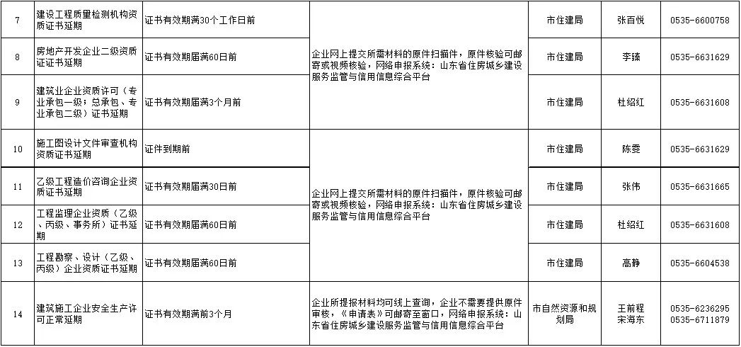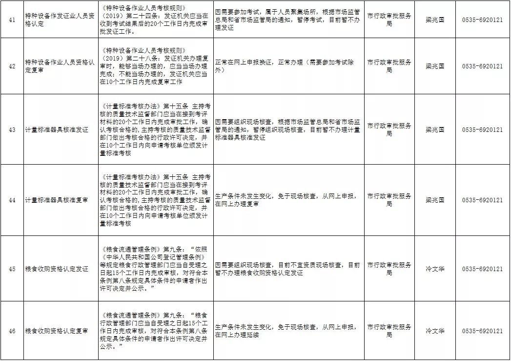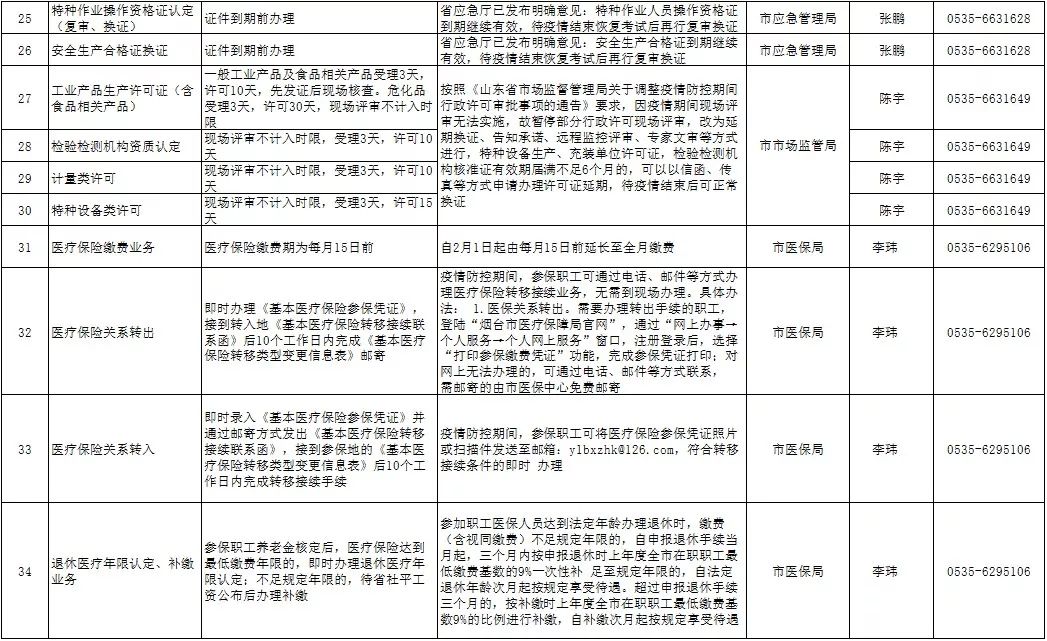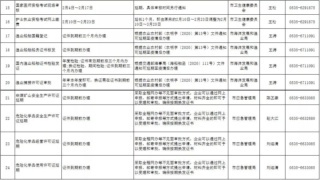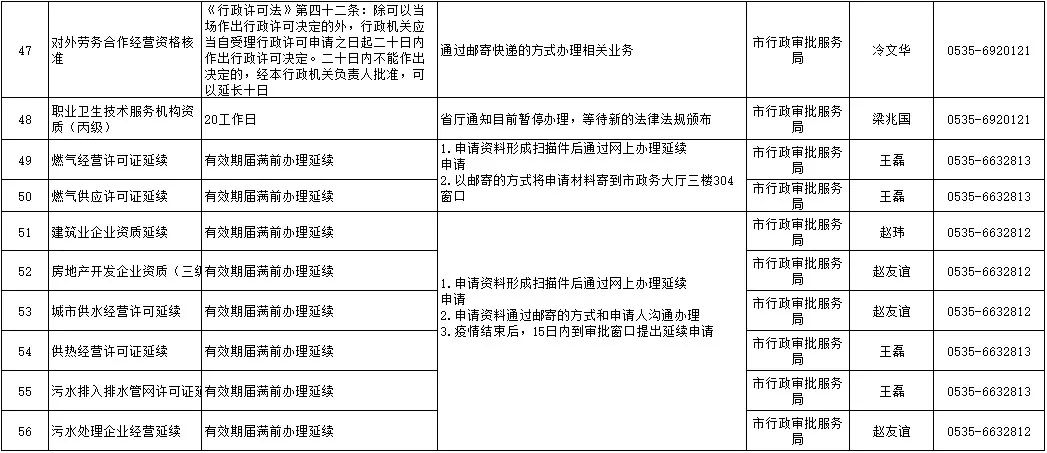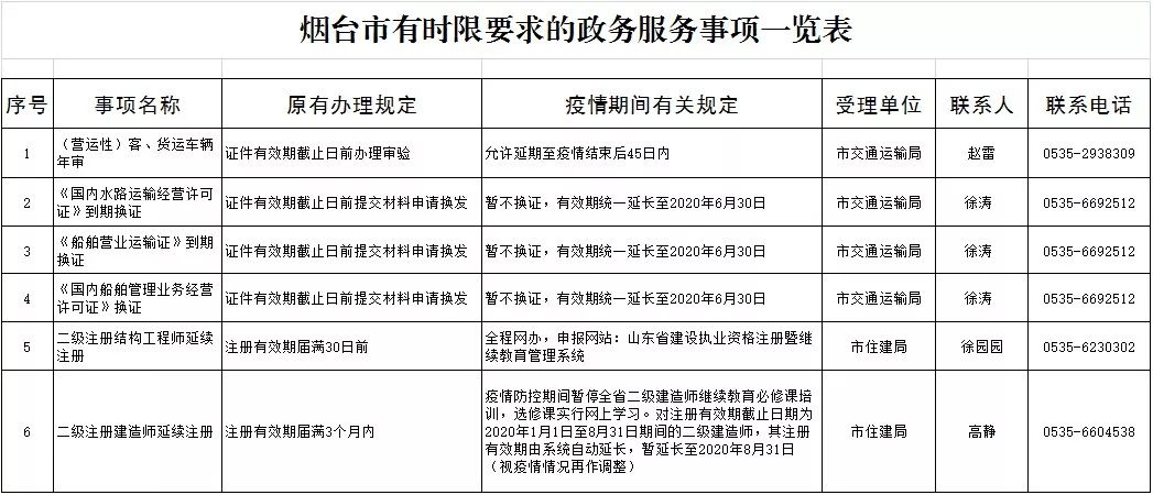 為保障疫情防控和政務(wù)服務(wù)兩不誤,煙臺(tái)市政務(wù)服務(wù)管理辦公室梳理出三大類(lèi)65項(xiàng)有時(shí)限要求的政務(wù)服務(wù)事項(xiàng)。其中有56項(xiàng)可網(wǎng)上辦、延期辦,具體包括:建設(shè)工程質(zhì)量檢測(cè)機(jī)構(gòu)資質(zhì)證書(shū)延期、施工圖設(shè)計(jì)文件審查機(jī)構(gòu)資質(zhì)證書(shū)延期等30項(xiàng),(營(yíng)運(yùn)性)客、貨運(yùn)車(chē)輛年審、居民身份證到期換領(lǐng)等26項(xiàng)。另有,檢驗(yàn)檢測(cè)機(jī)構(gòu)資質(zhì)認(rèn)定等9個(gè)事項(xiàng)暫停受理,將根據(jù)疫情防控形勢(shì),由國(guó)家、省相關(guān)行政主管部門(mén)確定具體恢復(fù)時(shí)間。詳細(xì)情況公布如下: