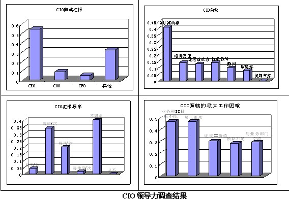 《信息周刊》最近對中國CIO領導力進行了調查,調查結果顯示:45%的中國CIO直接向總裁或CEO匯報工作,而其他CIO向COO、CFO或者其他高級經理層匯報;只有8%的CIO在組織中扮演著組織戰(zhàn)略家的角色,大多(41%)CIO還只是扮演著項目推動者的角色;只有38%的CIO至少每周向直接主管匯報,而多達40%的CIO沒有固定時間向主管匯報;將近一半(47%)的CIO任務自己最大的困難是業(yè)務目標和IT項目間缺乏統(tǒng)一性和員工素質和能力有待提高。(信息周刊 2006)