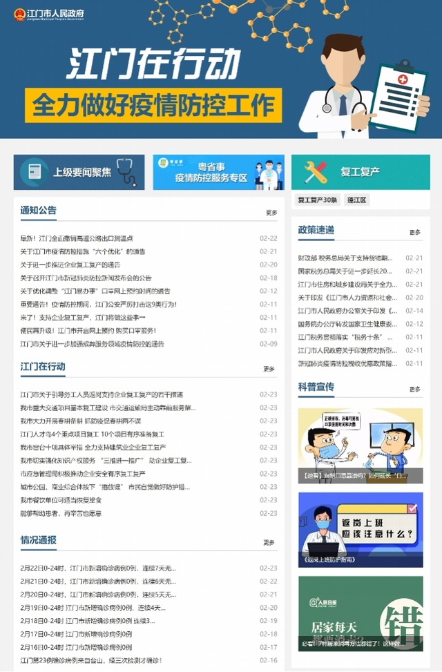開辟疫情信息發(fā)布陣地。第一時間在政府門戶網(wǎng)站開辟“江門在行動--全力做好疫情防控工作”宣傳專區(qū),設(shè)置“情況通報”、“政策速遞”、“復(fù)工復(fù)產(chǎn)”等7個欄目,及時發(fā)布權(quán)威信息,目前已累計發(fā)布疫情防控工作信息2453條。同時在“江門易辦事”APP增設(shè)“新型肺炎防疫專區(qū)”,設(shè)立“江門在行動”“情況通報”“科普宣傳”等多個版塊,為群眾提供江門本地最新發(fā)布的政策措施、防控指引、辟謠消息等重點(diǎn)信息,助力社會輿情穩(wěn)控。