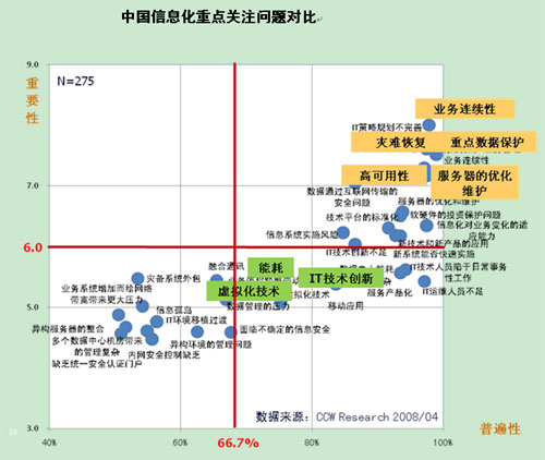 首先,CIO們的關注點更多地是集中于保證信息系統(tǒng)的正常運轉和對于現有業(yè)務的支持,例如,象服務器的優(yōu)化與維護、保障系統(tǒng)的高可用性、重要數據保護、保障業(yè)務持續(xù)性等。這些問題確實很重要,但是在信息化過程中屬于比較基礎的內容,卻占據了CIO關注點的最主要的地位。相應地,對于大規(guī)模的信息化基礎建設之后的優(yōu)化提升、信息化的可持續(xù)發(fā)展考慮較少,而對于IT支持業(yè)務創(chuàng)新、形成企業(yè)在IT環(huán)境下獨創(chuàng)競爭力的思考則更少。這一點我們從下圖中也可以看到,諸如IT技術創(chuàng)新、能耗、虛擬化技術等問題都處于較為次要的位置。
