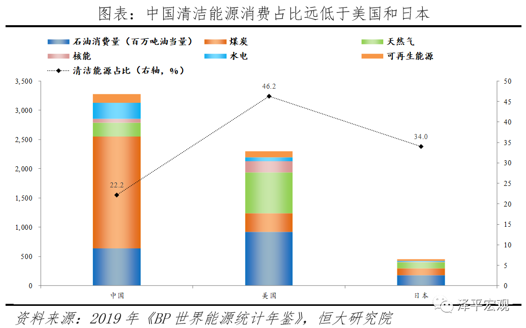 在清潔能源消費比例方面,根據(jù)2019年《BP世界能源統(tǒng)計年鑒》,2018年中國能源消費中煤炭、石油、天然氣、水電、核能、可再生能源分別占比58.2%、19.6%、7.4%、8.3%、2.0%和4.4%,清潔能源合計占22.1%;而美國分別占比13.8%、40.0%、30.5%、2.8%、8.4%和4.5%,清潔能源占46.2%;日本分別占比25.9%、40.2%、21.9%、4.0%、2.4%和5.6%,清潔能源占34.0%。