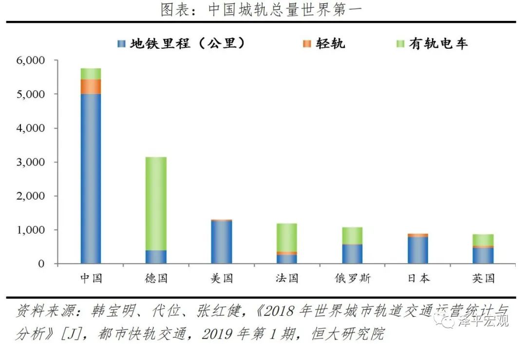 4)城軌:中國軌道交通里程居世界第一,人均高于美國,但低于日英法德俄。按照國際較為常用的分類方法,城軌分為地鐵、輕軌和有軌電車三類,從總量上看,根據(jù)《2018年世界城市軌道交通運營統(tǒng)計與分析》,我國城軌里程共計5766.7公里,位居世界第一,占全球總里程的22.09%;其中地鐵、輕軌和有軌電車里程分別為5013.3、420.8和332.6公里,分別占全球地鐵和輕軌里程的35.3%、32.5%和3.1%,地鐵、輕軌里程也是世界第一。但從人均來看,中國人均城軌里程4.1公里/百萬人,高于美國的4.0,但低于日本的7.0、英國的13.1、法國17.7、德國的38.0和俄羅斯的7.5。