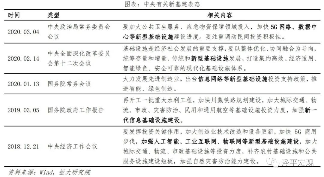 中央近期密集點名新基建,其內(nèi)涵不應(yīng)局限在信息領(lǐng)域。新基建在2018年12月中央經(jīng)濟工作會議被第一次提及,2019年寫入國務(wù)院政府工作報告,2020年1月國務(wù)院常務(wù)會議、2月中央深改委會議、3月中央政治局常委會議持續(xù)密集部署。從中央會議內(nèi)容看,新基建側(cè)重于5G網(wǎng)絡(luò)、數(shù)據(jù)中心、人工智能、工業(yè)互聯(lián)網(wǎng)、物聯(lián)網(wǎng)等新一代信息技術(shù)。