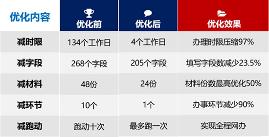前期,建行山東省分行配合省政府辦公廳完成100個(gè)“一件事”主題式服務(wù)和100個(gè)高頻民生服務(wù)事項(xiàng)的流程優(yōu)化。以“我要開(kāi)營(yíng)利性養(yǎng)老院”主題為例,通過(guò)線上辦理、并聯(lián)審批、數(shù)據(jù)共享、容缺受理或告知承諾等途徑進(jìn)行流程優(yōu)化,辦理時(shí)限可壓縮97%,填寫(xiě)字段數(shù)減少23.5%,材料份數(shù)最高可優(yōu)化50%,跑動(dòng)次數(shù)降低至1次,實(shí)現(xiàn)全程網(wǎng)辦。