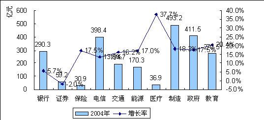 圖1 2004年中國主要行業(yè)IT應(yīng)用市場投資及增長情況