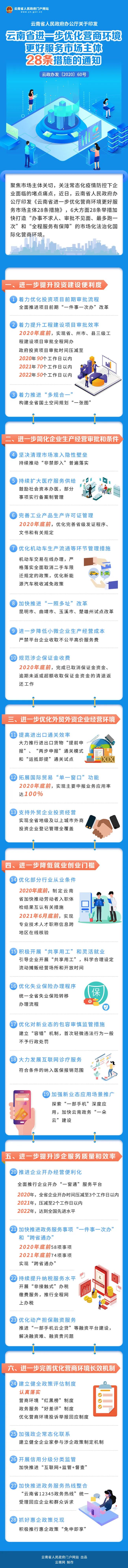 為貫徹落實《國務(wù)院辦公廳關(guān)于進(jìn)一步優(yōu)化營商環(huán)境更好服務(wù)市場主體的實施意見》(國辦發(fā)〔2020〕24號)精神,進(jìn)一步聚焦市場主體關(guān)切,尤其是常態(tài)化疫情防控下企業(yè)面臨的堵點痛點,加快打造“辦事不求人、審批不見面、最多跑一次”和“全程服務(wù)有保障”的市場化法治化國際化營商環(huán)境,推動云南高質(zhì)量跨越式發(fā)展,近日,云南省人民政府辦公廳印發(fā)《云南省進(jìn)一步優(yōu)化營商環(huán)境更好服務(wù)市場主體28條措施》(以下簡稱《措施》)。