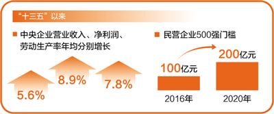 國企規(guī)模實力持續(xù)增強,效益穩(wěn)步提高。預(yù)計到今年底,中央企業(yè)資產(chǎn)總額將接近69萬億元,比“十二五”末增長45%。“十三五”以來,中央企業(yè)營業(yè)收入、凈利潤、勞動生產(chǎn)率年均分別增長5.6%、8.9%、7.8%,進入世界500強的中央企業(yè)達到48家。民企改革發(fā)展成效顯著?!笆濉币詠?,民營企業(yè)500強門檻從2016年的100億元提升至2020年的200億元;創(chuàng)新創(chuàng)業(yè)創(chuàng)造熱情高漲,中小企業(yè)數(shù)量增長近1倍。
