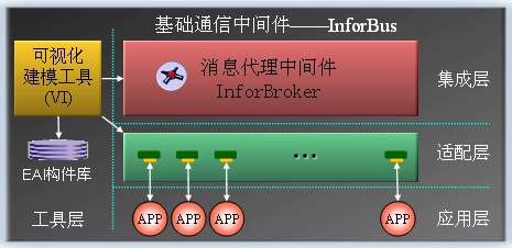 InforEAI,建立在基礎(chǔ)通信中間件InforBus(CORBA ORB)之上;內(nèi)置消息代理中間件InforBroker提供XML的消息總線服務(wù)和集線器(Hub)式的集成服務(wù);采用可視化的構(gòu)件協(xié)同建模工具(VI),通過直觀拖放構(gòu)件來(lái)組裝與配置應(yīng)用適配器;通過管理工具,實(shí)現(xiàn)適配器的遠(yuǎn)程部署和管理。