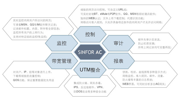 SINFOR M5X000-AC上網(wǎng)行為管理設(shè)備是國內(nèi)領(lǐng)先的內(nèi)網(wǎng)安全整體解決方案。在內(nèi)部安全的上網(wǎng)行為管理(網(wǎng)絡(luò)安全審計)上,為防止員工在工作時間濫用互聯(lián)網(wǎng),SINFOR AC提供了強大的網(wǎng)絡(luò)控制和監(jiān)控功能,有效提高了員工的工作效率和企業(yè)的生產(chǎn)力。