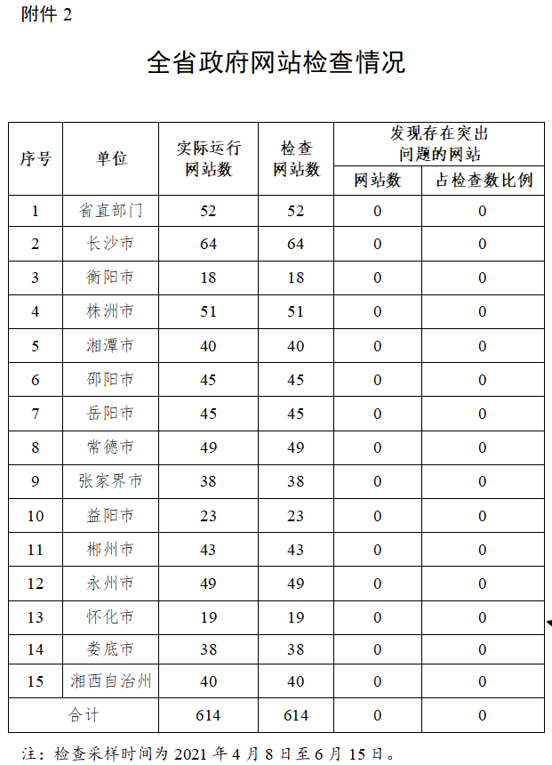 2021年第二季度,省政務(wù)局組織對(duì)全省正常運(yùn)行的614家政府網(wǎng)站進(jìn)行全覆蓋檢查,無(wú)存在突出問(wèn)題政府網(wǎng)站,總體檢查合格率100%。重點(diǎn)檢查了50家省直單位網(wǎng)站互動(dòng)交流功能,其中省長(zhǎng)信箱欄目有32家單位、部門(mén)直通車(chē)欄目有20家單位實(shí)現(xiàn)了對(duì)簡(jiǎn)單常見(jiàn)咨詢問(wèn)題1個(gè)工作日內(nèi)準(zhǔn)確答復(fù)(詳見(jiàn)附表1)。對(duì)全省正常運(yùn)行的2157家政務(wù)新媒體進(jìn)行普查,發(fā)現(xiàn)8家存在單項(xiàng)否決問(wèn)題,總體合格率99.63%,其中長(zhǎng)沙市、衡陽(yáng)市、株洲市、湘潭市、邵陽(yáng)市、常德市、張家界市、郴州市、永州市、懷化市、婁底市、湘西自治州政務(wù)新媒體檢查合格率100%。