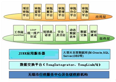 無錫市行政系統(tǒng)包括六大平臺,分別為審批管理平臺、項目審批平臺、審批監(jiān)管平臺、審批服務(wù)平臺、審批辦公平臺和審批交換平臺。該系統(tǒng)符合電子政務(wù)建設(shè)規(guī)范,是電子政務(wù)的核心組成部分之一。系統(tǒng)整體框架如下: