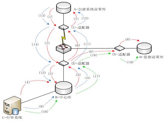 注:紅線表示自建系統(tǒng)辦理業(yè)務(wù)產(chǎn)生的數(shù)據(jù)流。藍線表示由行審系統(tǒng)發(fā)起的聯(lián)辦件通知自建系統(tǒng)參與聯(lián)辦的數(shù)據(jù)流。綠線表示在行審系統(tǒng)中辦理業(yè)務(wù)產(chǎn)生的數(shù)據(jù)流。