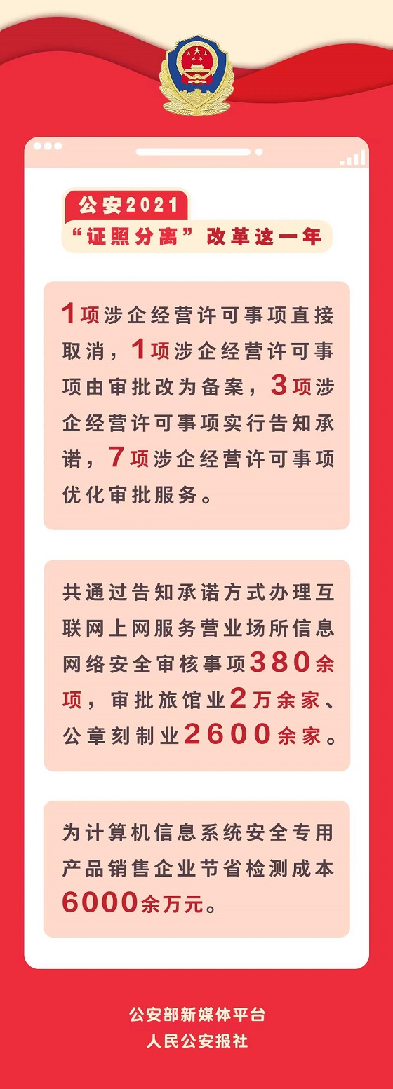 2021年,全國公安機(jī)關(guān)大力推進(jìn)審批制度改革,將12項(xiàng)涉企經(jīng)營許可事項(xiàng)納入“證照分離”改革工作方案,不斷推動(dòng)各項(xiàng)措施落地見效,有效壓縮了審批時(shí)效、優(yōu)化了審批流程,進(jìn)一步優(yōu)化營商環(huán)境,激發(fā)市場(chǎng)主體發(fā)展活力。