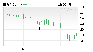 eBay在9月15日時收盤價為22美元,市值268億美元;至11月20日收盤價為11.17美元,市值142.6億美元,市值縮水125億美元,縮水幅度達(dá)53%。