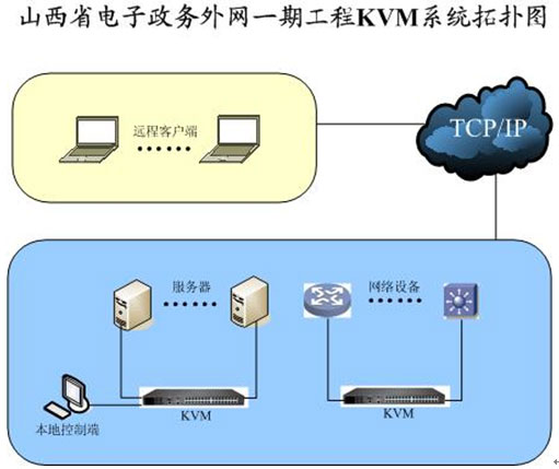 為了提高系統(tǒng)運(yùn)行維護(hù)管理水平,減少人員頻繁進(jìn)出機(jī)房,減少鍵盤、鼠標(biāo)顯示器的數(shù)量,體現(xiàn)節(jié)能和環(huán)保的要求,曙光配備了高性能的KVM機(jī)房設(shè)備。通過KVM設(shè)備使機(jī)房所有的設(shè)備都可以到網(wǎng)絡(luò)/環(huán)境監(jiān)控中心進(jìn)行管理和配置,實現(xiàn)遠(yuǎn)程監(jiān)控。綜合考慮KVM系統(tǒng)需求,拓?fù)浣Y(jié)構(gòu)如下: