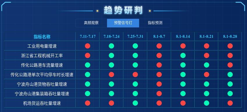 三是預(yù)警更直觀:智能分析高頻數(shù)據(jù)周增速環(huán)比變化情況,以紅、藍(lán)、綠三色信號(hào)燈形式展示經(jīng)濟(jì)運(yùn)行情況,及時(shí)發(fā)現(xiàn)經(jīng)濟(jì)運(yùn)行苗頭性、傾向性、趨勢(shì)性問(wèn)題。