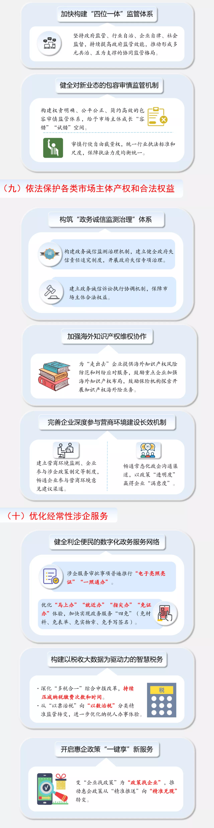 此外,每項(xiàng)措施均設(shè)置了事前事中事后全鏈條監(jiān)管專項(xiàng)舉措,建立起貫穿市場主體全生命周期、銜接事前事中事后全監(jiān)管環(huán)節(jié)的新型監(jiān)管機(jī)制,健全市場自律、政府監(jiān)管、社會監(jiān)督互為支撐的協(xié)同監(jiān)管格局,確保創(chuàng)新試點(diǎn)改革風(fēng)險總體可控,并為新經(jīng)濟(jì)發(fā)展?fàn)I造開放包容、規(guī)范有序的市場環(huán)境。