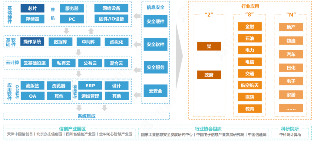 從產(chǎn)業(yè)鏈角度看,信創(chuàng)生態(tài)體系主要由基礎硬件、基礎軟件、應用軟件、信息安全及云計算平臺幾部分組成。
