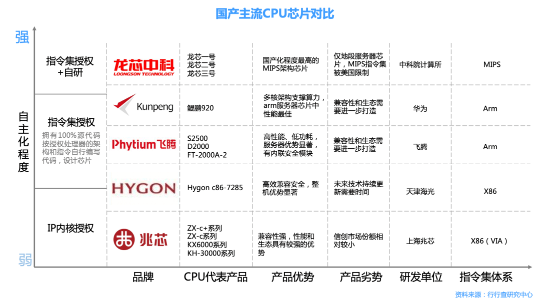 國外主流的CPU 廠商主要有Intel、AMD;國內(nèi)CPU 廠商主要有鯤鵬、龍芯、兆芯、海光信息、飛騰、申威等。