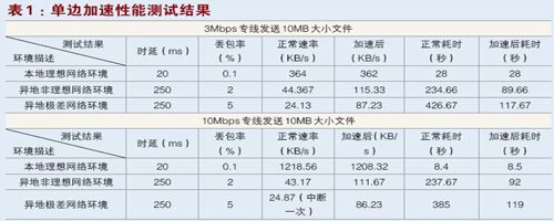 M6000-AD設(shè)備所具有的獨特TCP單邊加速功能,可以令用戶在不安裝任何軟件和插件的情況下很好解決用戶的鏈路延遲和丟包問題,在模擬的3Mbps專線和10Mbps專線兩種帶寬下,本地理想網(wǎng)絡(luò)環(huán)境、異地非理想網(wǎng)絡(luò)環(huán)境、異地極差網(wǎng)絡(luò)環(huán)境三種不同鏈路情況下發(fā)送10MB大小文件進行了測試,詳情見表1:
