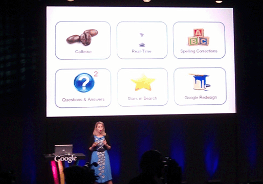 9:40:谷歌副總裁瑪麗莎?梅耶爾(Marissa Mayer)登臺,她首先做了一些簡要的描述:每周有10億用戶通過Google搜索。接著她討論了Google搜索的一些新功能。如Google Caffeine,實(shí)時搜索,時間軸瀏覽,問答功能增強(qiáng)等。