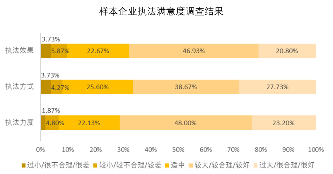 執(zhí)法上,約七成企業(yè)認(rèn)為執(zhí)法的效果、方式和力度是合理的。69.6%的企業(yè)“很滿意”或“滿意”現(xiàn)行的執(zhí)法標(biāo)準(zhǔn),67.73%“很滿意”或“滿意”執(zhí)法效果,66.4%“很滿意”或“滿意”執(zhí)法方式。