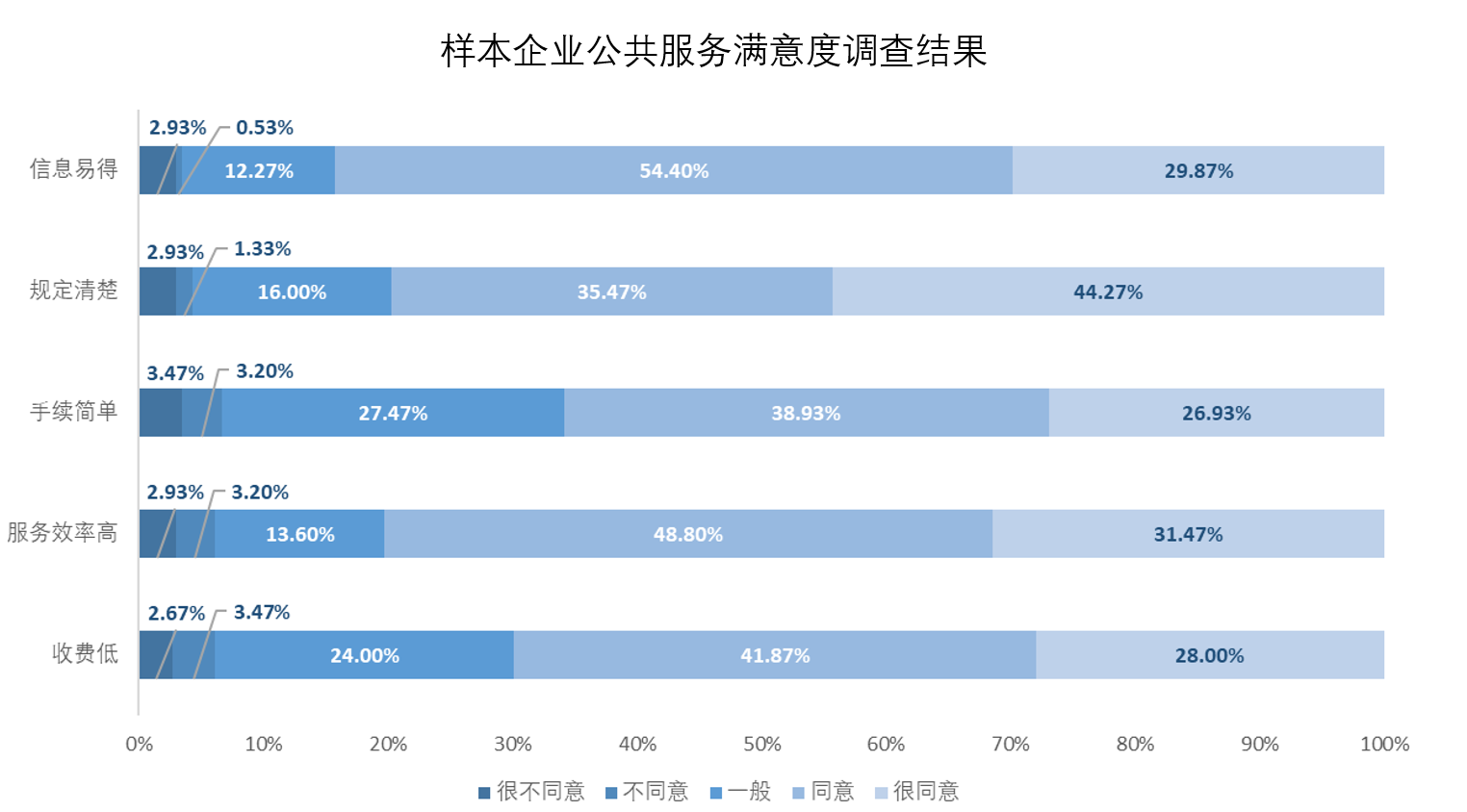 樣本企業(yè)對上海公共服務(wù)的平均滿意百分比為78.6%,其中選擇“滿意”和“很滿意”的比例從高到低為84.27%(信息易得)、80.27%(服務(wù)效率)、79.74%(規(guī)定清晰)、69.87%(費(fèi)用水平)和65.86%(手續(xù)簡單)。