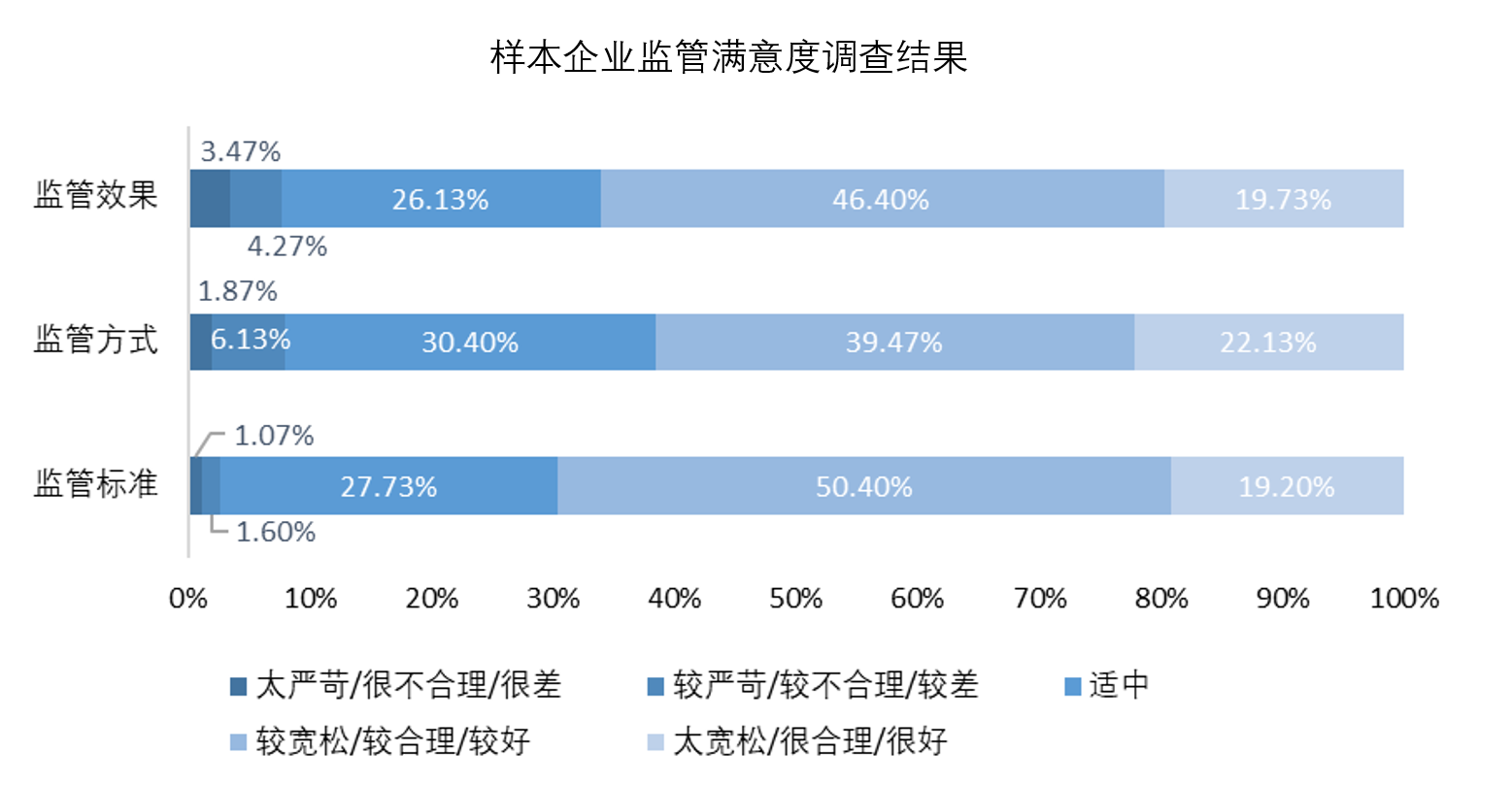 66%的樣本企業(yè)對監(jiān)管執(zhí)法總體“滿意”或“很滿意”。其中,對監(jiān)管標(biāo)準(zhǔn)表示滿意的企業(yè)占69.6%,對監(jiān)管效果表示滿意的企業(yè)占66.13%,對監(jiān)管方式表示滿意的企業(yè)占61.6%。