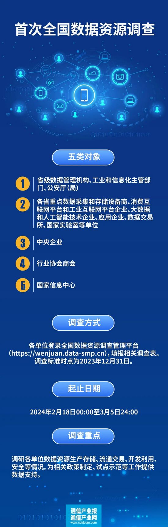 2月19日,國家數(shù)據(jù)局、中央網(wǎng)絡(luò)安全和信息化委員會辦公室、工業(yè)和信息化部、公安部聯(lián)合發(fā)出通知,為貫徹落實(shí)《數(shù)字中國建設(shè)整體布局規(guī)劃》工作部署,摸清數(shù)據(jù)資源底數(shù),加快數(shù)據(jù)資源開發(fā)利用,更好發(fā)揮數(shù)據(jù)要素價值,四部門開展全國數(shù)據(jù)資源情況調(diào)查,調(diào)研各單位數(shù)據(jù)資源生產(chǎn)存儲、流通交易、開發(fā)利用、安全等情況,為相關(guān)政策制定、試點(diǎn)示范等工作提供數(shù)據(jù)支持。