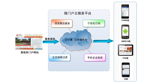 通過(guò)云計(jì)算及云存儲(chǔ)技術(shù),快速接駁現(xiàn)有互聯(lián)網(wǎng)政府信息公開平臺(tái),以標(biāo)準(zhǔn)接口和移動(dòng)客戶端界面開發(fā)調(diào)用現(xiàn)有平臺(tái)數(shù)據(jù),實(shí)現(xiàn)政府信息公開方式,在不需要投入硬件的前提下,完成網(wǎng)站信息公開內(nèi)容在手機(jī)終端上的展現(xiàn)。