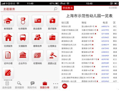 中國(guó)上海政府移動(dòng)平臺(tái)中涵蓋了資訊,辦事,互動(dòng),查詢,消息通知,應(yīng)用推薦,天氣預(yù)報(bào)等眾多功能板塊,其所包含的內(nèi)容覆蓋了城市生活的各個(gè)方面。