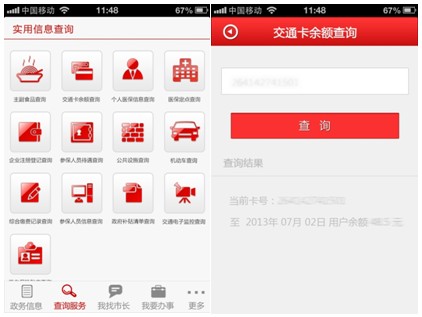 通過(guò)手機(jī)查詢窗口可以提供豐富的查詢功能,如:食品價(jià)格、交通卡余額、醫(yī)保信息、公積金、機(jī)動(dòng)車違章、企業(yè)注冊(cè)信息查詢、服務(wù)熱線查詢、交通線路查詢、養(yǎng)老保險(xiǎn)、政府補(bǔ)貼等等便民查詢內(nèi)容,這些查詢內(nèi)容不僅能夠給群眾帶來(lái)便利而且還大大提高了政府的公信力。(如圖2圖3政府移動(dòng)平臺(tái)查詢展現(xiàn))