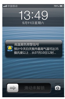 移動(dòng)互聯(lián)網(wǎng)本身最大的亮點(diǎn)之一就是信息的及時(shí)通知,這可以節(jié)省大量短信費(fèi)用。政府應(yīng)嘗試和探索采用最新移動(dòng)互聯(lián)網(wǎng)技術(shù),將政府出臺(tái)的最新惠民政策、天氣、道路情況以及重大災(zāi)情預(yù)警等相關(guān)內(nèi)容通過(guò)信息推送提供給用戶,為用戶帶來(lái)方便及時(shí)的服務(wù)動(dòng)態(tài)。(如圖1高溫推送通知)同時(shí),推送的信息有別于傳統(tǒng)短信,并支持語(yǔ)音、視頻等多媒體消息推送,同時(shí)能支持個(gè)性化訂閱,防止垃圾信息擾民。