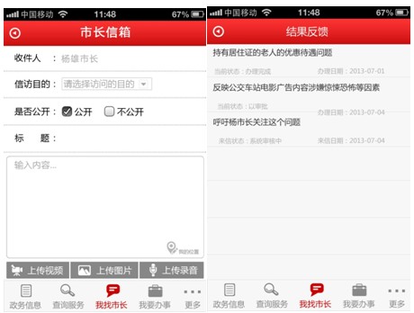 公眾互動(dòng)是政府與群眾溝通的一個(gè)重要橋梁,政府通過(guò)互動(dòng)窗口了解民生動(dòng)態(tài),群眾通過(guò)互動(dòng)窗口提交自己的意愿和對(duì)政府進(jìn)行監(jiān)督建議,再加上手機(jī)的便捷性,大部分網(wǎng)民可利用碎片時(shí)間進(jìn)行網(wǎng)上互動(dòng),遇到需要投訴、建議時(shí)可以隨時(shí)拿出手機(jī),加上移動(dòng)客戶端拍照、語(yǔ)音、視頻等功能可以記錄現(xiàn)場(chǎng)即時(shí)情況,交互方式上也更加便捷,這將比只能做在辦公桌前打開(kāi)電腦的互動(dòng)交流模式更加即時(shí)、直觀和方便。(如圖8圖9給市長(zhǎng)寫信)