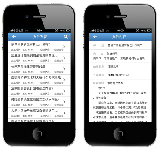 通過移動(dòng)終端可以實(shí)時(shí)查看辦件列表,關(guān)注自己提交的辦件或是他人提交辦件處理的情況。充分知情政民交互的內(nèi)容,可以方便地瀏覽熱點(diǎn)處理信息和常見問題信息。