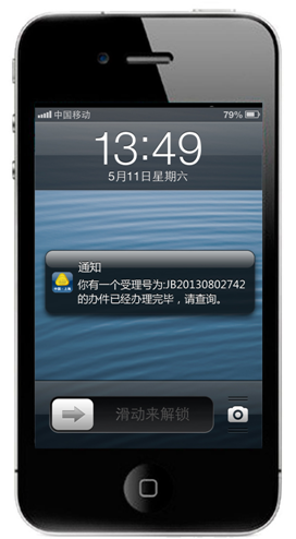 移動(dòng)終端系統(tǒng)可以綁定用戶手機(jī)的設(shè)備ID,并在手機(jī)上自動(dòng)記錄提交的辦件編號(hào),供將來進(jìn)行辦件查詢。這將比電腦更加方便。
