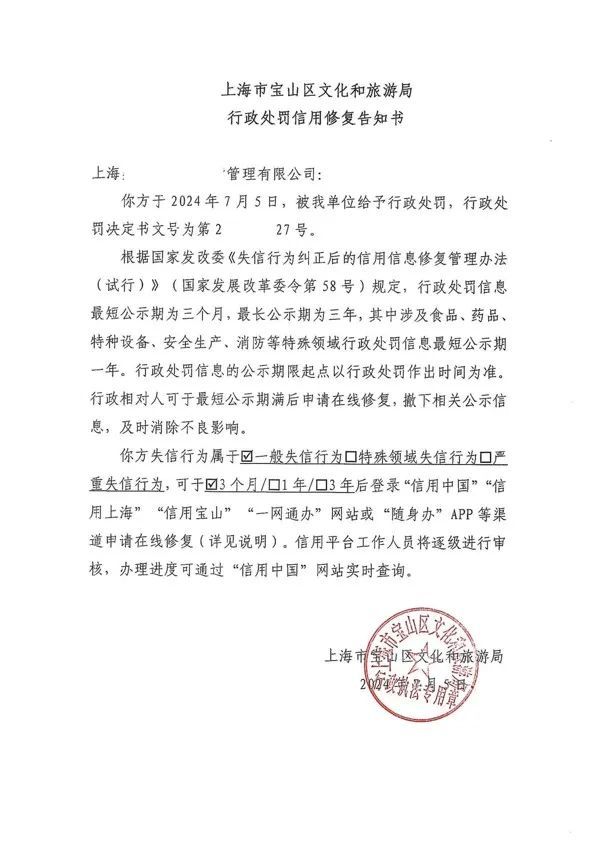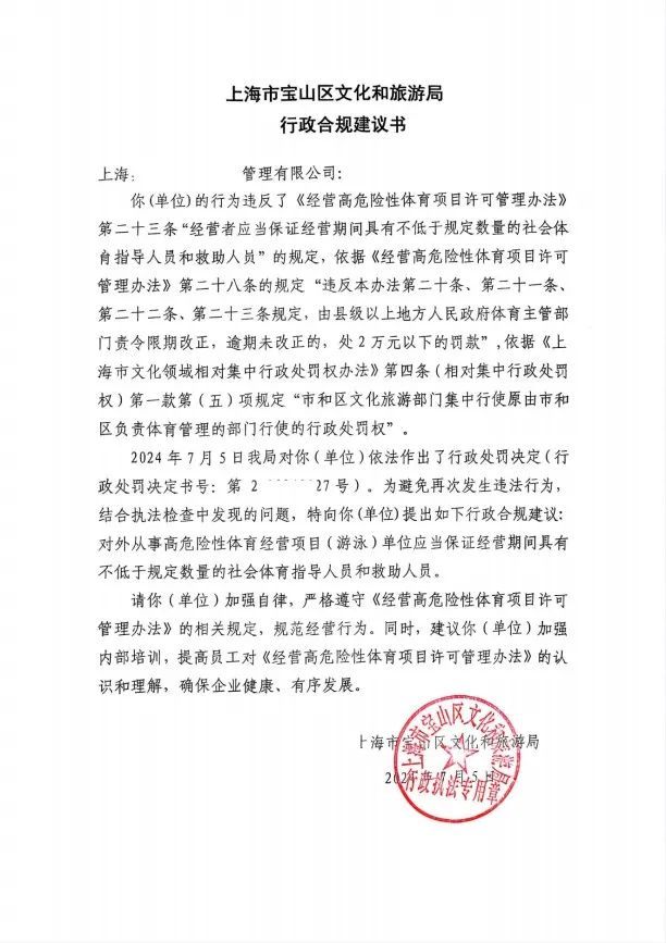 今年7月5日,寶山區(qū)文化和旅游局依照“誰處罰、誰負責”原則,“點對點”向區(qū)內一家酒店管理公司送達首份“三書”,當事人因違反《經營高危險性體育項目許可管理辦法》相關規(guī)定被區(qū)文旅局執(zhí)法大隊處以罰款,除《行政處罰決定書》一并送達的還有《行政合規(guī)建議書》和《信用修復告知書》。
