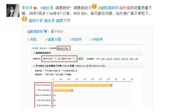 該公司專門針對(duì)天貓店推出的整合營(yíng)銷套餐“站外寶”,組合郵件和微博兩大渠道,成為天貓店站外流量的“法寶”,其能夠帶來(lái)快速、精準(zhǔn)、高效流量得到眾多天貓旗艦店的口碑相傳。