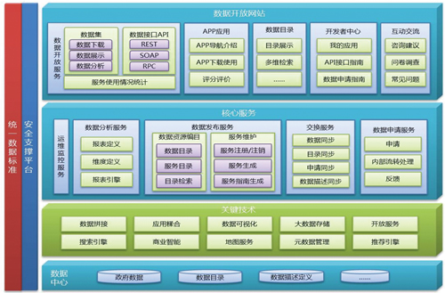 其中,數(shù)據(jù)中心統(tǒng)一存放要對(duì)外發(fā)布的政府?dāng)?shù)據(jù),包括政府?dāng)?shù)據(jù)、數(shù)據(jù)目錄和數(shù)據(jù)描述定義;核心服務(wù)是對(duì)數(shù)據(jù)開(kāi)放網(wǎng)站提供的支撐服務(wù),包括數(shù)據(jù)申請(qǐng)服務(wù)、交換服務(wù)、數(shù)據(jù)發(fā)布服務(wù)、數(shù)據(jù)分析服務(wù)和運(yùn)維監(jiān)控服務(wù);數(shù)據(jù)開(kāi)放網(wǎng)站是數(shù)據(jù)開(kāi)放服務(wù)的載體,是面向社會(huì)的窗口,主要包括數(shù)據(jù)開(kāi)放服務(wù)、APP應(yīng)用、數(shù)據(jù)目錄、開(kāi)發(fā)者中心和互動(dòng)交流版塊。