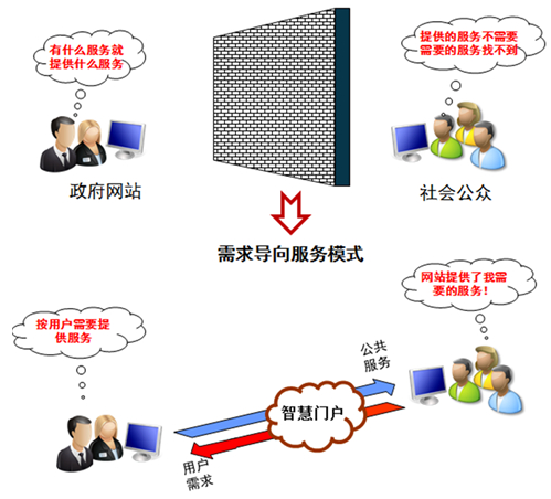 第二,智慧政府門戶的服務(wù)模式是以用戶需求為導(dǎo)向。政府網(wǎng)站是服務(wù)社會(huì)公眾的重要平臺(tái),用戶需求是網(wǎng)站服務(wù)供給的基本指向,智慧政府門戶彌補(bǔ)了傳統(tǒng)“供給導(dǎo)向”服務(wù)模式的弊端,開啟“需求導(dǎo)向”的服務(wù)新模式,如圖1所示;