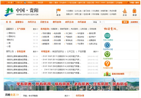 貴陽(yáng)市政府門(mén)戶(hù)網(wǎng)站采用以服務(wù)對(duì)象、網(wǎng)站功能相結(jié)合的多維度方式進(jìn)行規(guī)劃和設(shè)計(jì)。頻道按照用戶(hù)對(duì)象分為政務(wù)、企業(yè)、市民、旅游;同時(shí)欄目按照政務(wù)信息、網(wǎng)上辦事、互動(dòng)交流等網(wǎng)站功能的相關(guān)文件以及電子政務(wù)發(fā)展趨勢(shì)要求和民生服務(wù)需求設(shè)立欄目,凸顯國(guó)內(nèi)一流政府網(wǎng)站的建設(shè)理念。