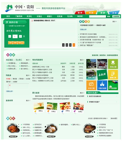 旅游信息服務(wù)平臺(tái):采用綠色與目前生態(tài)貴陽(yáng)的口號(hào)一致,也體現(xiàn)了政府在這方面的重視,整個(gè)網(wǎng)站看起來(lái)很清爽。排版采用與民息息相關(guān)的幾大類(lèi)(吃、住、行、游、購(gòu)、娛)進(jìn)行分類(lèi)排版,并采用很多特效來(lái)提高視覺(jué)感,減少視覺(jué)疲勞。