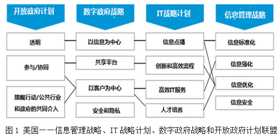 美國政府已將數(shù)字戰(zhàn)略和信息管理、IT以及開放政府計(jì)劃有機(jī)結(jié)合起來(圖1)。