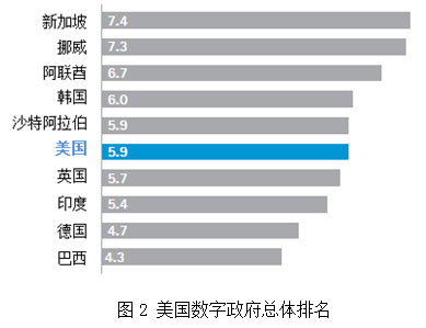 美國的數(shù)字政府業(yè)績(jī)?cè)谑畟€(gè)國家中名列第六,得分是5.9分(圖2)。