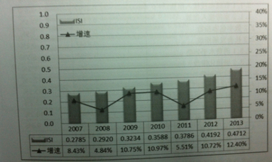 報告顯示,2013年中國信息社會總指數(shù)(ISI)達到0.4712,同比增長12.4%,增速較上年提高1.68個百分點,仍處于工業(yè)社會向信息社會加速轉(zhuǎn)型的歷史進程中。
