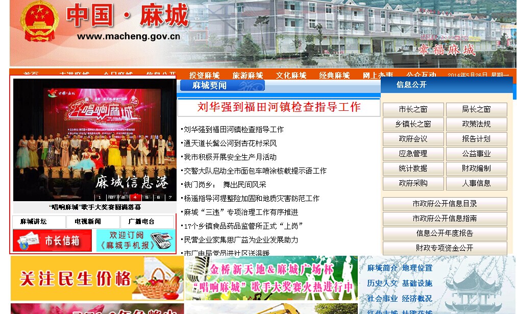 26日上午,記者打開麻城政府網(wǎng)(http://www.macheng.gov.cn/),發(fā)現(xiàn)“黃州總督”反映的情況屬實(shí)。記者看到,在麻城政府網(wǎng)首頁最醒目的“麻城要聞”下方,一幅彩色的“金橋新天地&麻城廣場杯‘唱響麻城’歌手大獎(jiǎng)賽”廣告赫然入目,點(diǎn)擊該頁面,進(jìn)入的是麻城信息港關(guān)于歌手大賽的宣傳集納頁面;而在首頁“政府公文”欄目下方,“融輝集團(tuán)招賢納士”、“融輝金鋪‘搶購式’火爆熱銷”、“開盤勁銷95%”等6幅樓盤廣告正在輪流播放,該廣告占去了通欄二分之一的位置,點(diǎn)擊該廣告,進(jìn)入融輝集團(tuán)有限公司官方網(wǎng)站。