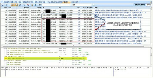 在校園網(wǎng)核心交換處通過科來回溯分析系統(tǒng)采集的數(shù)據(jù)包,我們通過TCP會(huì)話視圖可以看到從數(shù)據(jù)中心發(fā)過來的數(shù)據(jù)包的TCP序列號兩兩重復(fù),而且間隔時(shí)間非常短,從核心交換發(fā)往數(shù)據(jù)中心的數(shù)據(jù)包則沒有出現(xiàn)這種情況。這一現(xiàn)象可以排除TCP重傳的可能性,因?yàn)槌瑫r(shí)重傳需要等待兩倍RTT延時(shí),發(fā)送方不可能如此短的時(shí)間間隔重傳數(shù)據(jù)包。